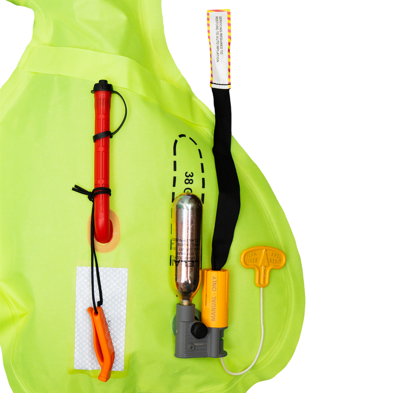 1F INFLATION MECHANISM ACTIVATES WHEN FULLY IMMERSED IN WATER VIA A REPLACEABLE CO2 CYLINDER