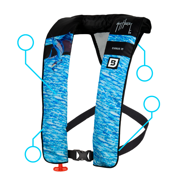 Immerse your self in world-renowned artist Guy Harvey patterns on the Bluestorm Cirrus 26 U.S. Coast Guard Approved Type V life jacket. Optimal protection even though you’ll be on shore long before the storm hits. These light slim fit vests are perfect for forgetting you are wearing them until the moment you need them. The Cirrus 26 provide almost twice the buoyancy of a foam PFD. You will be hard to miss with these amazing Guy Harvey patterns when paired with the new Glowspot air chamber material by Erez. GlowSpot® provides visible light at a range between 1-20 candelas per square meter (cd/m²) - 5 times more reflective than fabrics commonly used in life-jacket bladders.