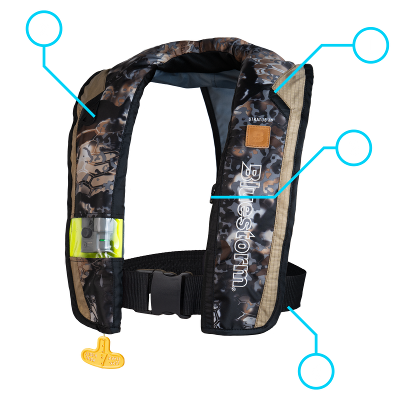 Soak in Kryptek Obskura Skyfall and Litus patterns on the Bluestorm Stratus 35 U.S. Coast Guard Approved Type II life jacket. For those looking for comfortable protection in a compact design. This USCG-approved inflatable life jacket offers over twice the buoyancy of a foam PFD and superior safety features for any type of water condition. This Stratus is designed to sit high and tight to the body and makes it a great fit for active kayakers, paddlers, and anglers. The outer shell and inner air chamber are engineered to fold flat and conform to the shape of your body inside and outside of the water. You will be hard to miss with these amazing Kryptek patterns when paired with the new Glowspot air chamber material by Erez. GlowSpot® provides visible light at a range between 1-20 candelas per square meter (cd/m²) - 5 times more reflective than fabrics commonly used in life-jacket bladders.